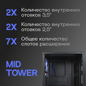Mid Tower • БП отсутствует • для плат ATX/micro-ATX/mini-ITX • в комплекте 1 вентилятор • окно: закаленное стекло • видеокарта до 330 мм • охлаждение ЦП до 160 мм • пылевые фильтры • 2xUSB 2.0 • 1xUSB-A 3.2 5Гбит/с • цвет черный