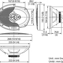 Тип: коаксиальная АС • Типоразмер: овал 6x9" (15x23 см) • Количество полос: 3 • Номинальная мощность: 45 Вт • Диапазон частот: 35-20000 Гц • Максимальная мощность: 400 Вт • Чувствительность: 91 дБ • Импенданс: 4 Ом • Тип магнита: неодимовый • Вес магнита: 220 г • Корзина: сталь • Диаметр НЧ/СЧ-динамика: 150 мм • Материал диффузора: полипропилен • Количество ВЧ-динамиков: 1